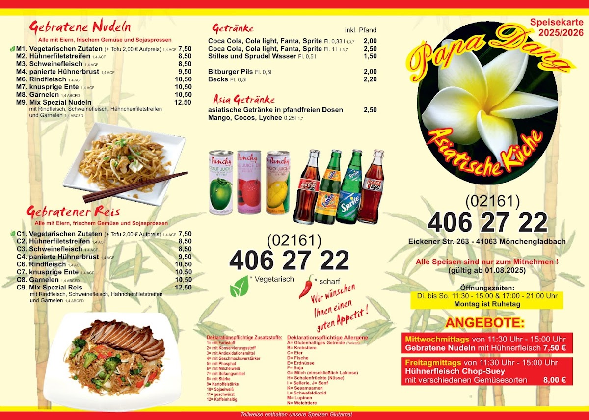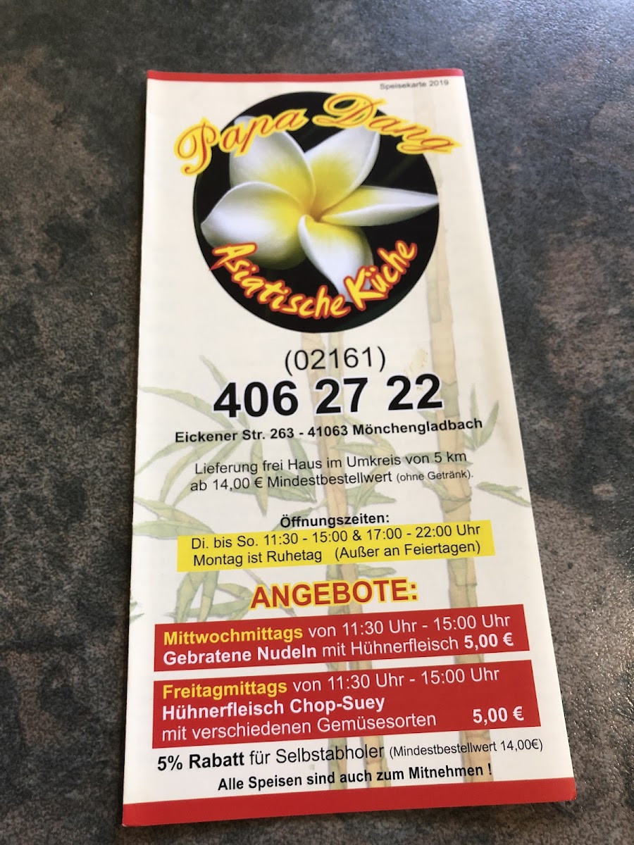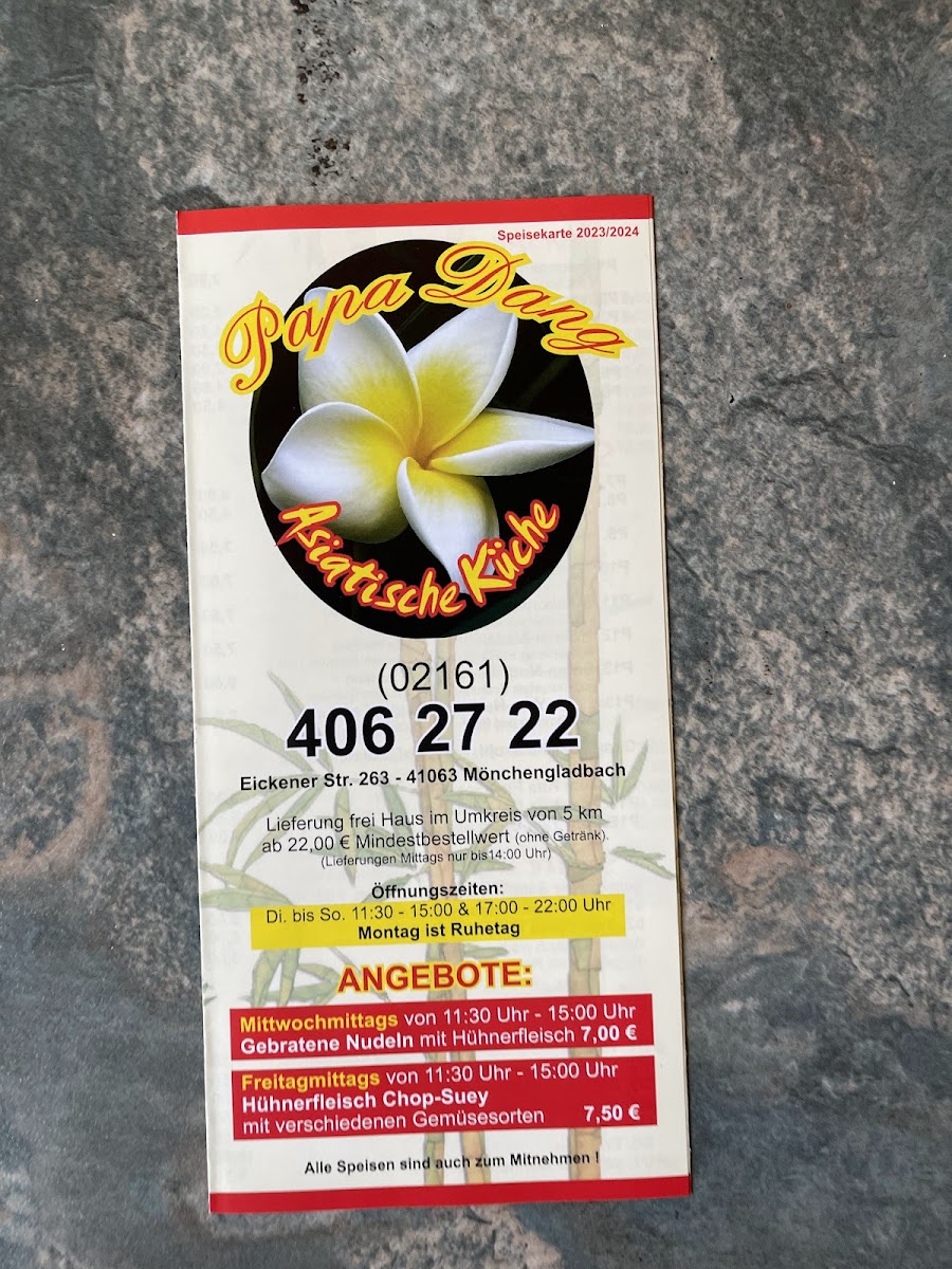 Welcome to Papa Dang, a hidden gem located at Eickener Str. 263, 41063 Mönchengladbach, Germany. This cozy spot has quickly become a favorite, lauded for its fresh ingredients and vibrant flavors. Customers rave about the house-made spring rolls and the aromatic Peking soup, both of which pack a delightful punch of flavor that stands out from typical Asian cuisine.